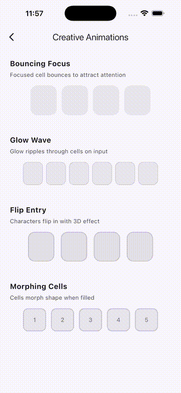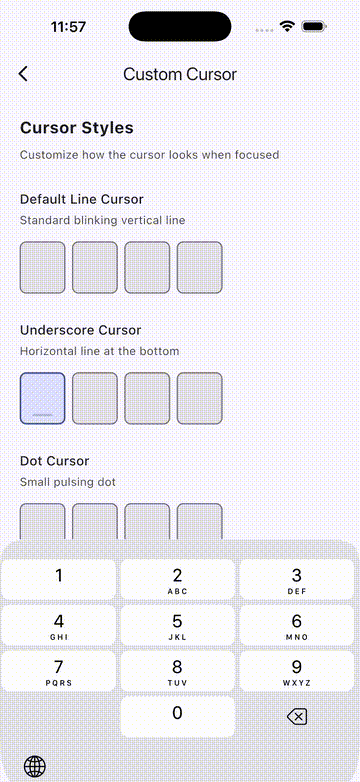 PinInputControllerfor text, focus, and error management - Multiple Shapes: Outlined, filled, underlined, and circle styles
